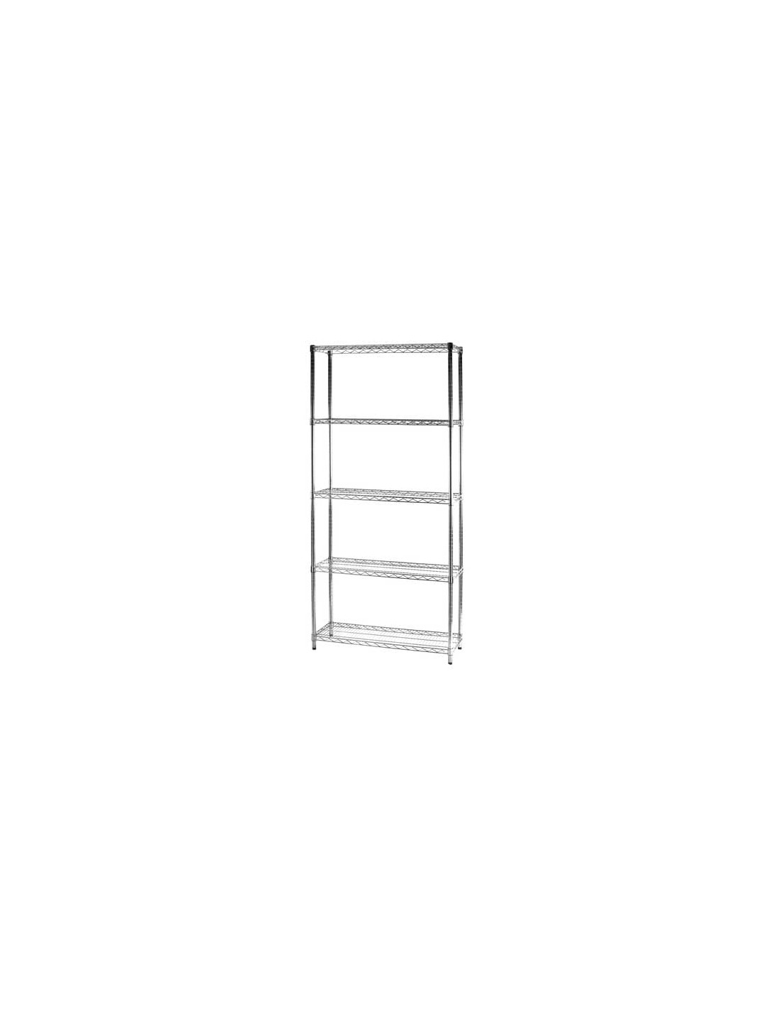 Scaffale in filo d'acciaio cromato completo di guancette per il fissaggio dei ripiani all'altezza desiderata. Tubolari con tappo superiore nero e piedini regolabili. Portata massima ripiani 100 kg. Spessore filo mm 6/4/3/GAP 20. Diametro tubolari 2,54cm. Dimensioni: L.90 x P.35 x H.200 cm. 5 ripiani. Colore acciaio cromato.