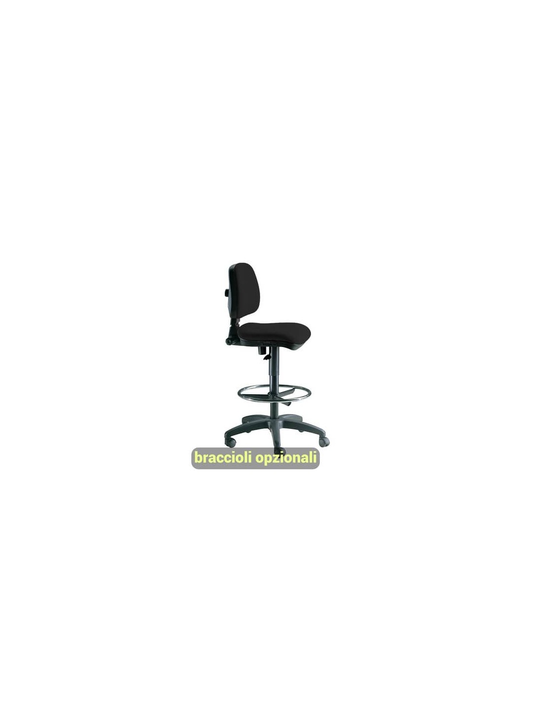 Sgabello tecnico girevole Esos EO0. Base in nylon, con poggiapiedi telescopico, schienale regolabile in altezza e profondità, meccanismo a contatto permanente, seduta con elevazione a gas.