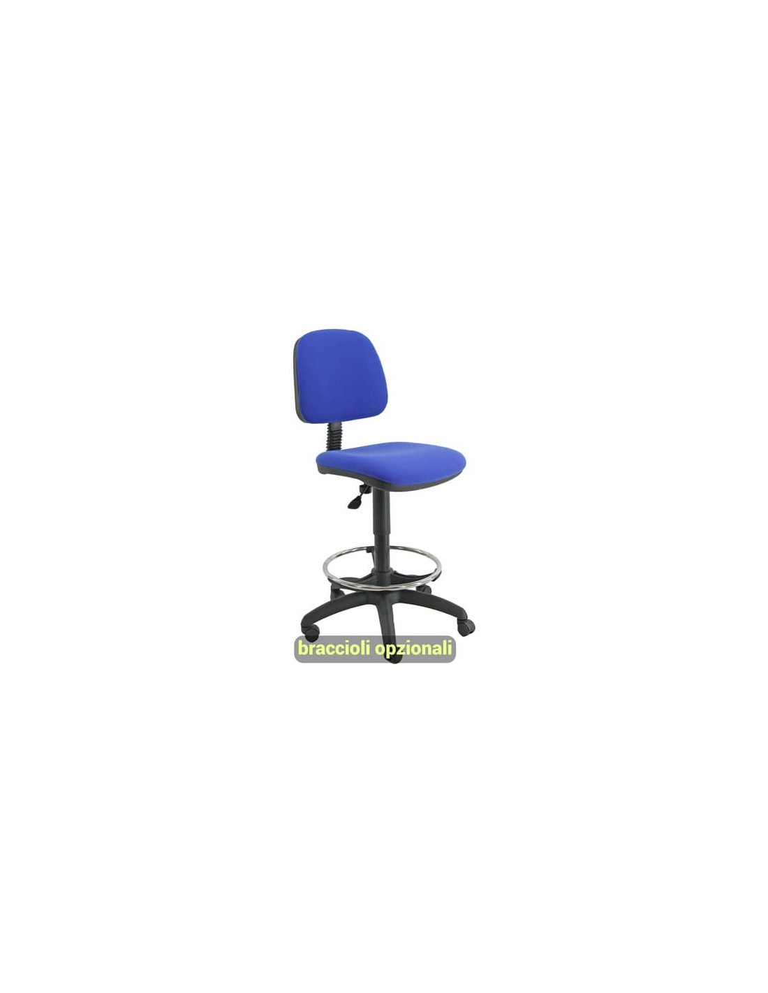 Seduta e schienale rivestiti in tessuto Eco, 100% Polipropilene 380g m/l, di colore blu. Con ruote, braccioli opzionali (codici 110074, 110075).