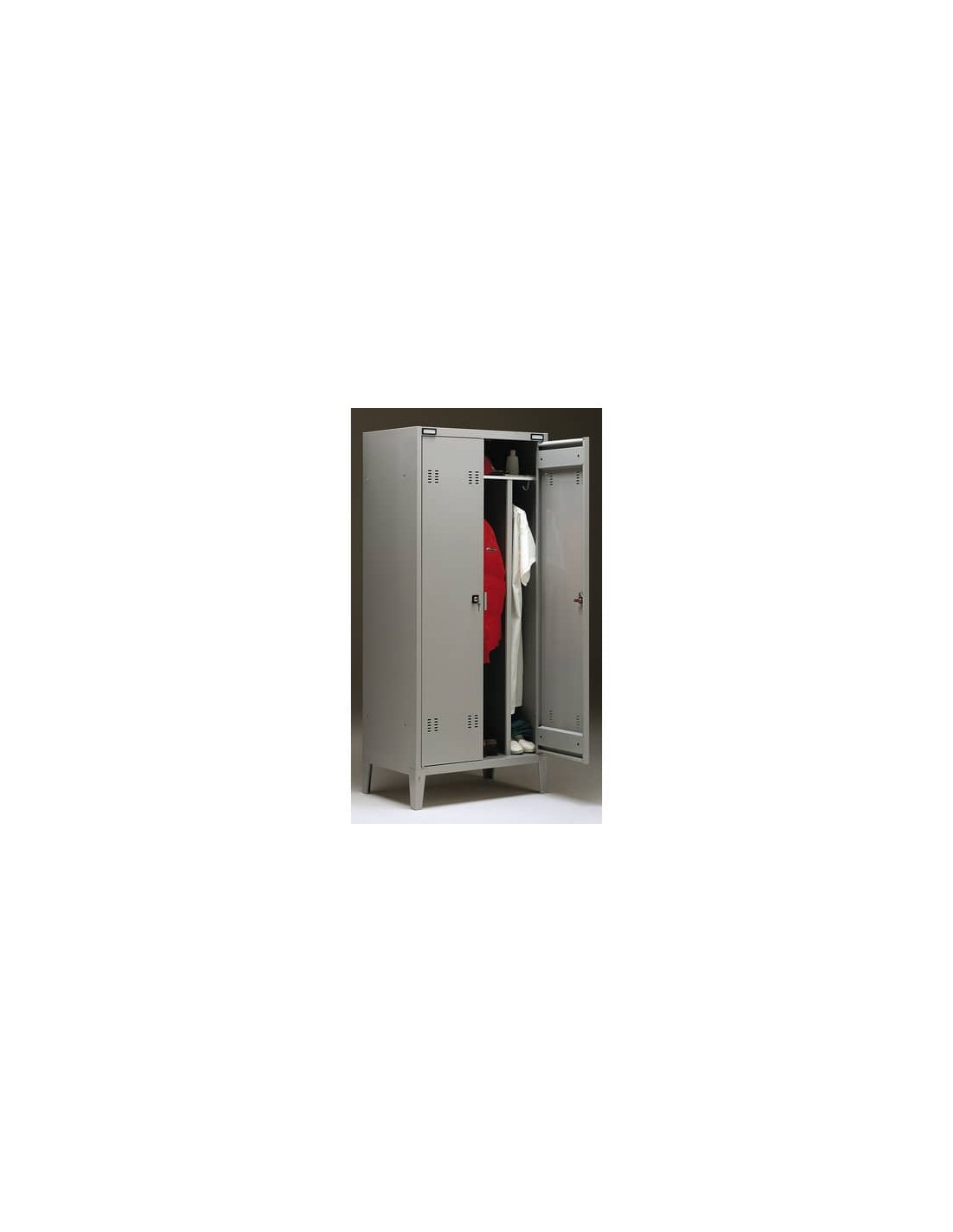 Spogliatoio Technical 2 a 2 posti sporco / pulito. Struttura in acciaio 7/10 monoblocco verniciata. Antine montate su cerniere interne antiscasso, dotate di feritoie di aerazione. Chiusura con serratura. Ripiano posaoggetti con sottostante separazione per indumenti puliti e da lavoro, portacartellino di serie.
