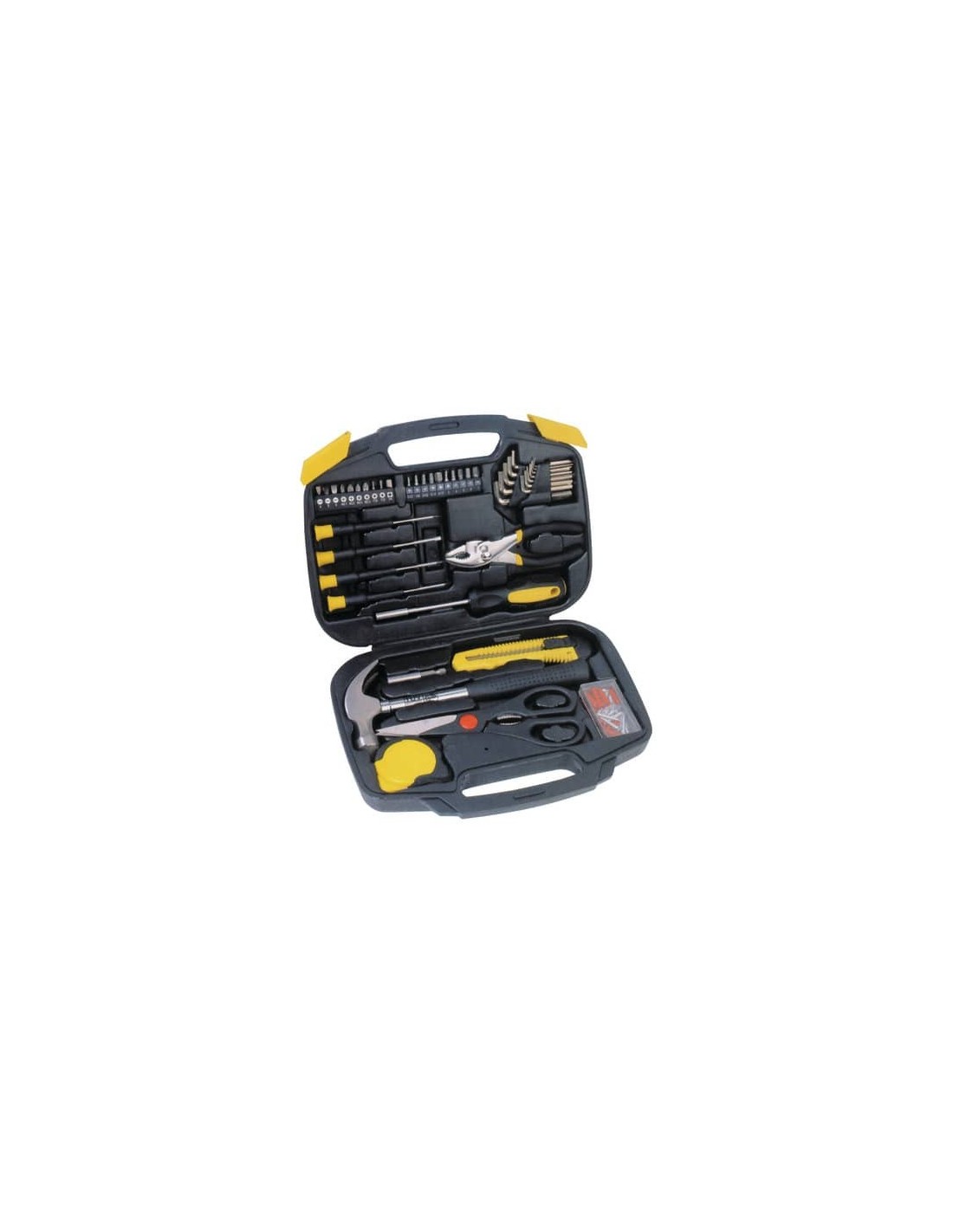 Valigetta kit manutenzione per casa e ufficio composto da 45 pezzi. Adatto per piccoli lavori domestici e manutenzioni. Costituito da: 1 cacciavite portainserti, 20 inserti Cr-V, 1 pinza con ganasce a slittamento 6'', 1 martello ad artiglio, 1 coltellino, 1 paio di forbici, 4 cacciaviti di precisione, 80 pezzi assortiti per il fissaggio, 1 metro a nastro 3 m, 12 chiavi esagonali.