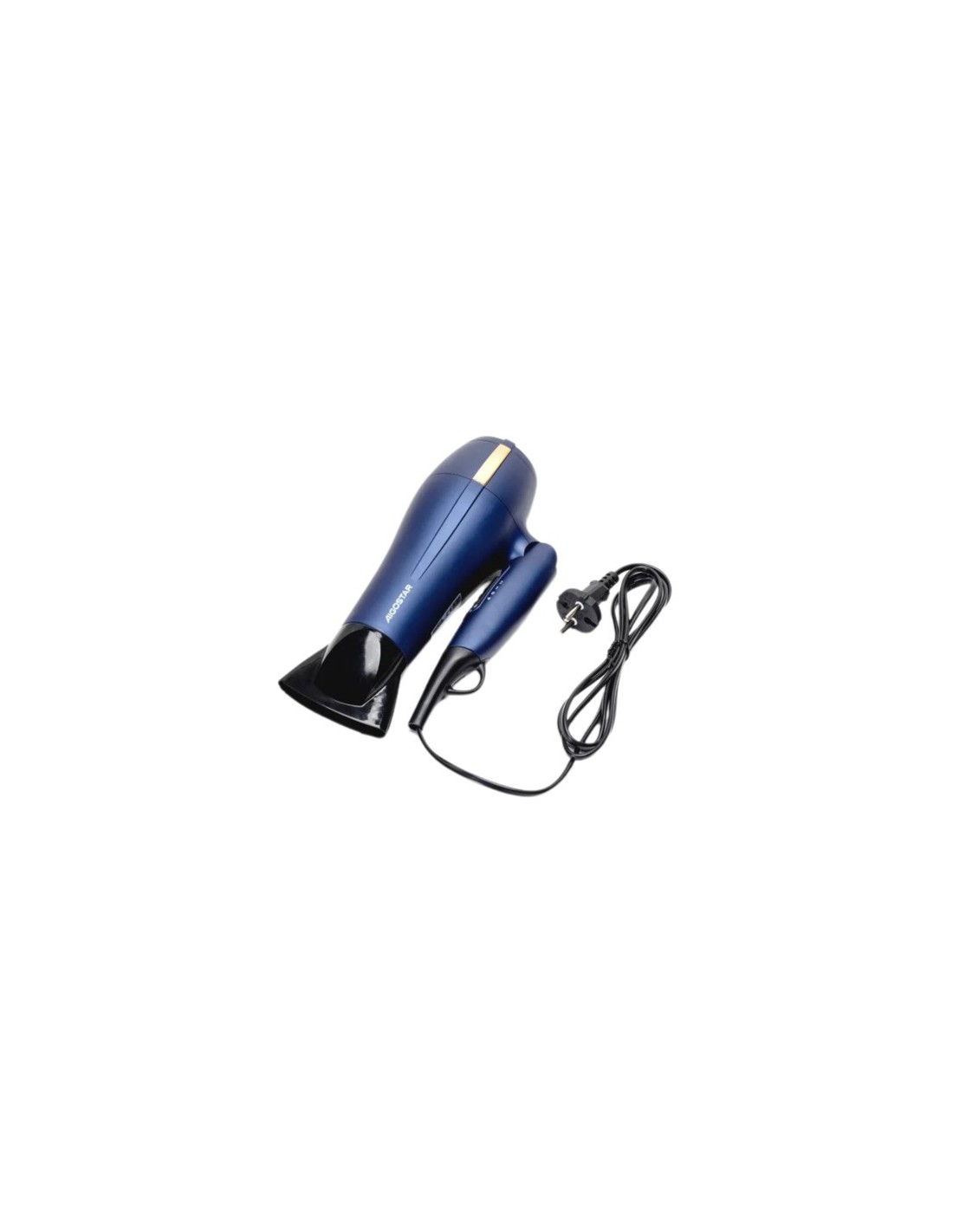 Asciugacapelli da 2200 W con manico pieghevole, 2 velocità e 3 temperature. Dotato di colpo d’aria fredda per fissare la piega, design compatto nelle colorazioni blu-oro e concentratore per uno styling preciso. Ideale per uso quotidiano e in viaggio.