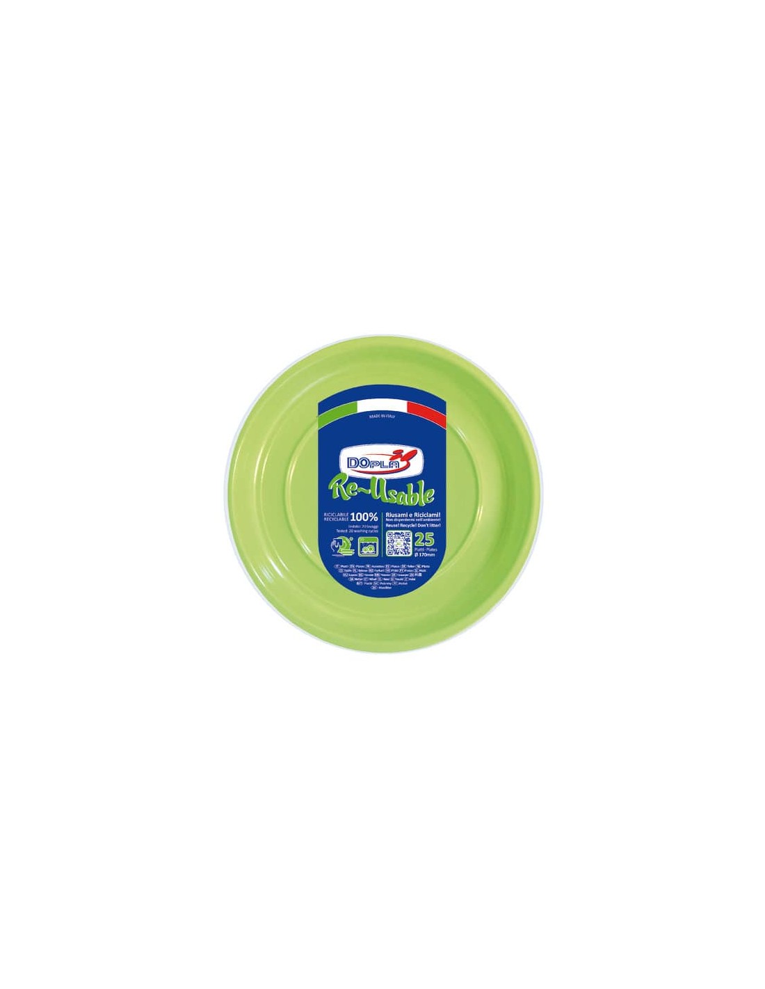 Piatti frutta verde acido in polistirene. Altezza: 18 mm. Diametro superiore: 170 mm. Diametro inferiore: 136 mm. Confezione da 25 pz. Adatto al contatto con alimenti a Max 90°C per 15'. No forni. Testato per 20 lavaggi in lavastoviglie. Reuse.