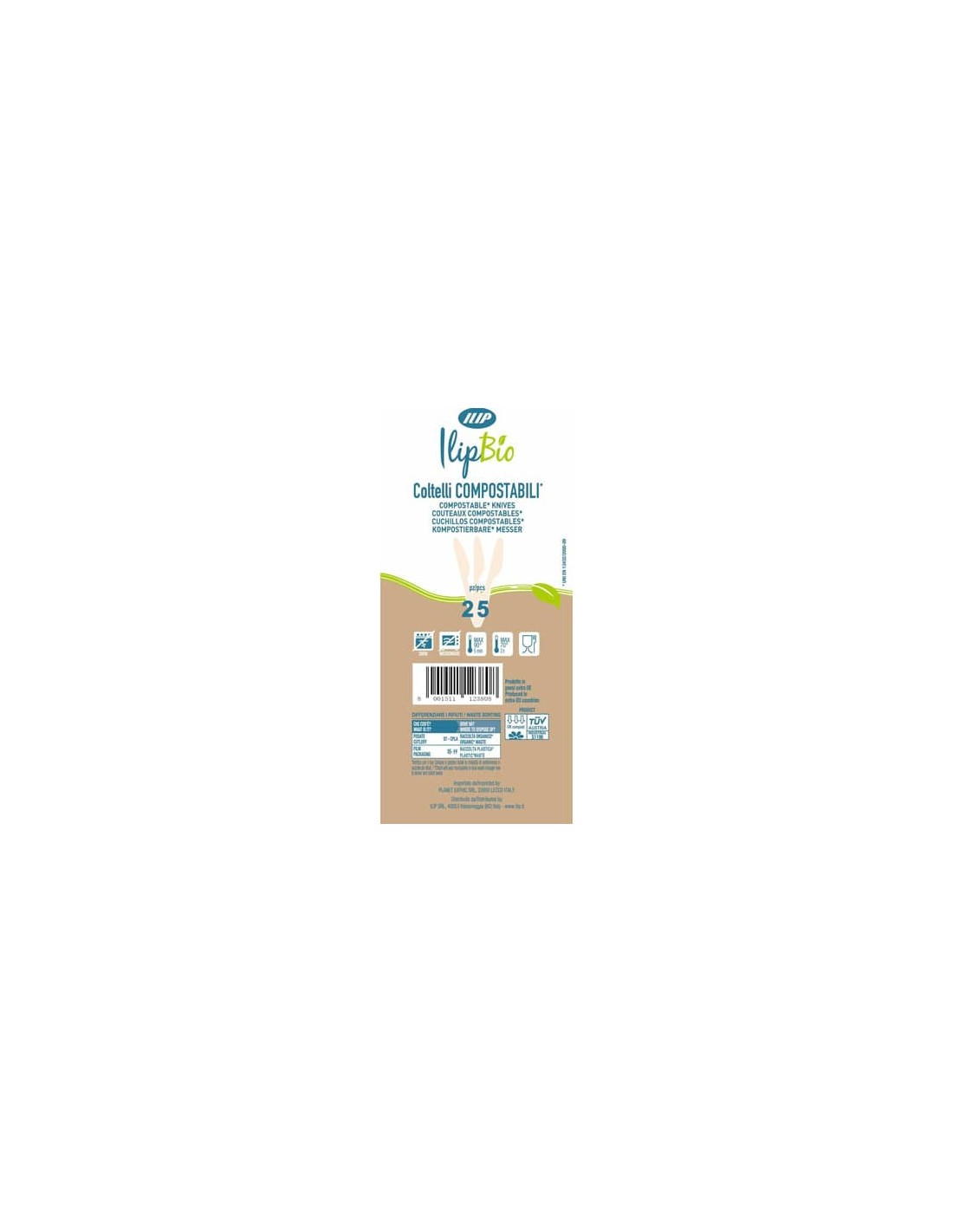 Coltelli in PLA BIO 3,5 g di colore bianco. In confezione da 25 coltelli. Prodotto idoneo a contenere bevande alimentari a base acquosa, acida ed alcolica a temperatura ambiente o inferiore per periodi di tempo prolungati e alla temperatura massima di 70°C per tempi inferiori a 2 h. Non utilizzare in forno o forno a microonde. Normative di riferimento 1935/2004/CE; D.M. 21/03/1973 e successivi aggiornamenti; Regolamento 10/2011/UE e successivi aggiornamenti; Direttiva 94/62/CE e successivi aggiornamenti; UNI EN 13432:2002.