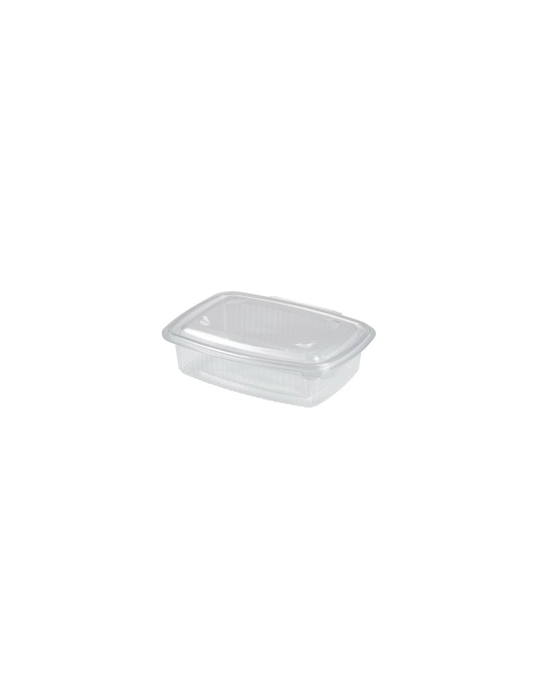 Vaschette con coperchio trasparente in polipropilene 500 ml. Confezione da 50 pezzi. Incernierato. Altezza: 57 mm. Contatto con alimenti: Max 90 °C per 15'. Microonde Max 500 Watt per 2'. No grill.