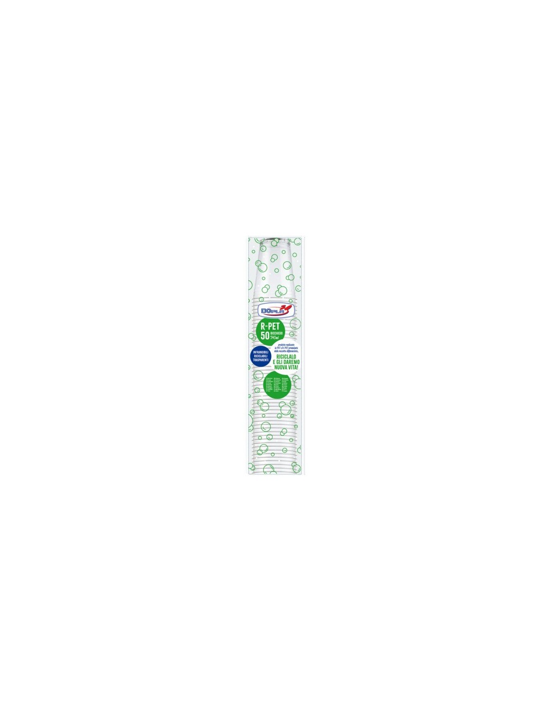 Bicchieri realizzati in R-PET trasparenti 540 ml (con tacca a 500 ml). Diametro superiore: 95 mm. Diamentro inferiore: 59 mm. Altezza: 132,8 mm. Adatti al contatto con alimenti fino a una temperatura massima di 50 °C per 1 ora. Prodotto conforme alle seguenti norme: Regolamento 1935/2004/CE, Regolamento 10/2011/UE e successivi aggiornamenti e modifiche, Regolamento 2023/2006/CE e successivi aggiornamenti e modifiche ed alla seguente legislazione italiana: Decreto Ministeriale 21/03/1973 e successivi aggiornamenti e modifiche, DPR 777/82 e successivi aggiornamenti e modifiche. Confezione composta da 50 pezzi.