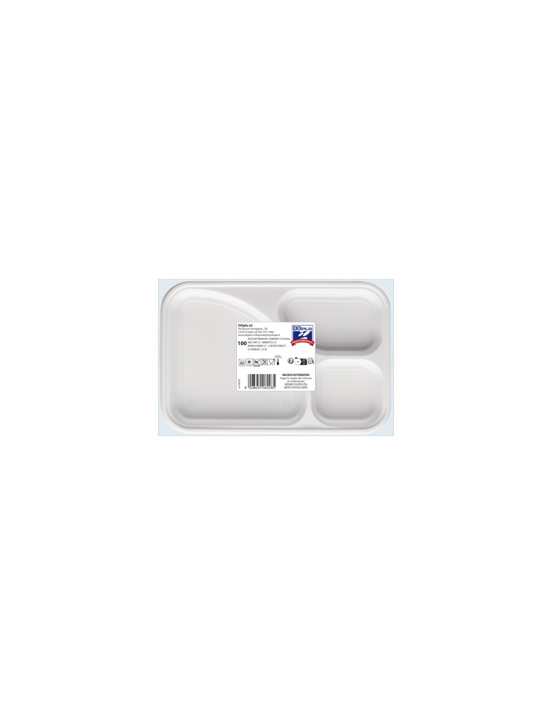 Vassoio rettangolare realizzato in polistirene a 3 scomparti. Dimensioni: 315 x 210 mm. Colore: bianco. Adatto al contatto con alimenti fino a una temperatura massima di 90 °C per 15 minuti. Non utilizzabili in forno Confezione composta da 100 pezzi.
