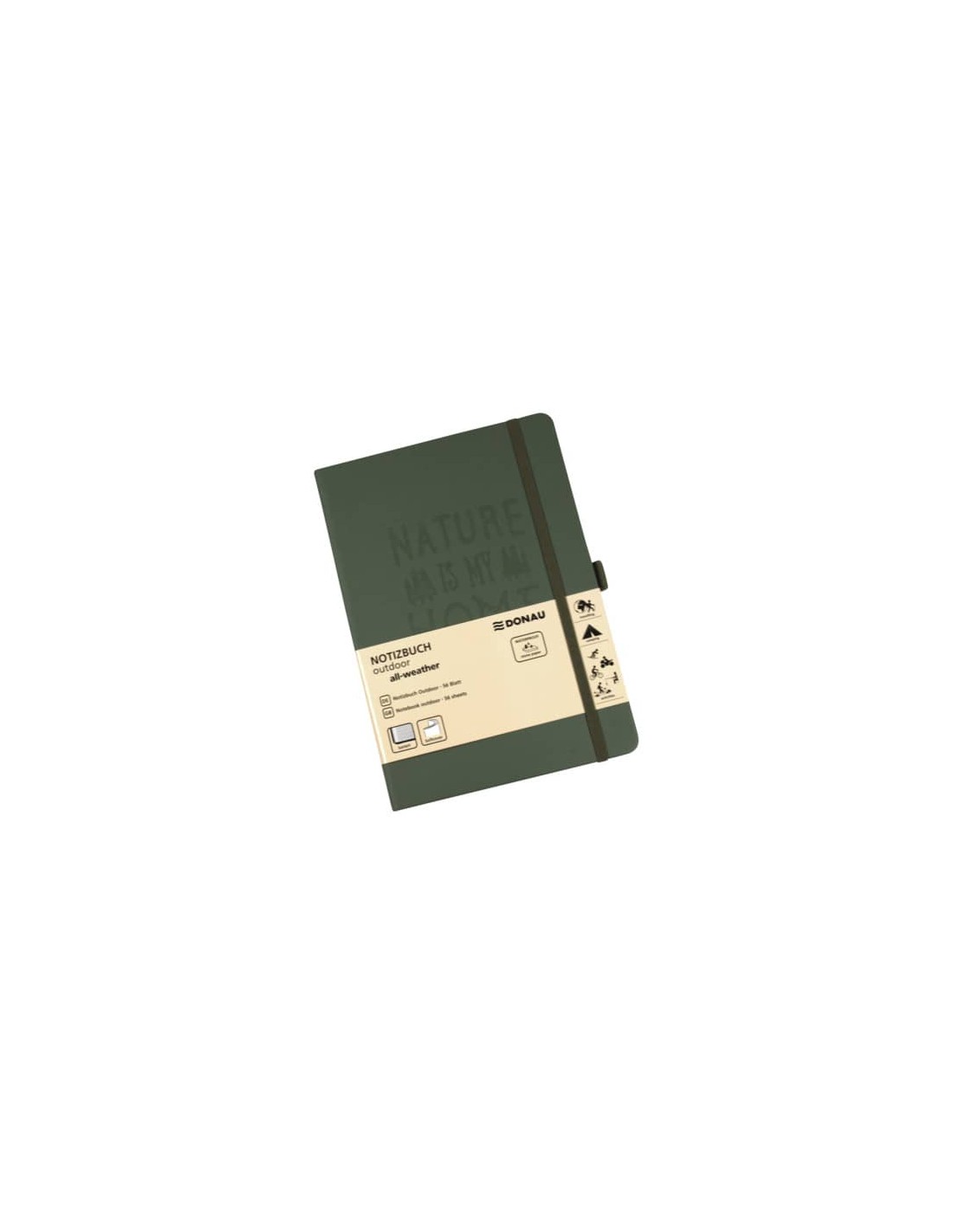 Taccuino per attività all'aperto (escursionismo, ciclismo, sci alpinismo, campeggio, pesca...). Formato A5. Copertina impermeabile in PU con disegno in rilievo. N°56 fogli di carta stone idrorepellente. Grammatura: 120 g/m². A scacchiera, con passante per penna, nastro da disegno e tasca per archivio. Formato: 151 x 215 mm. Colore verde oliva.