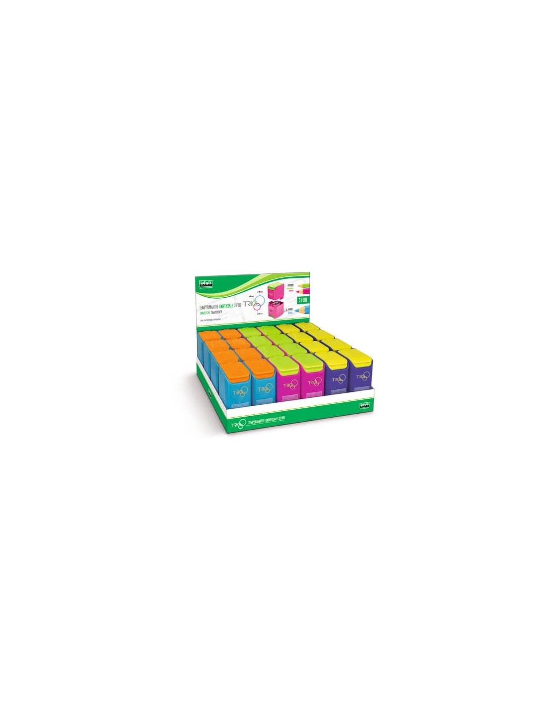 Temperamatite universale A 3 fori con coperchio e contenitore in plastica. Adatto per matite e pastelli standard (diametro 6/8 mm), matitoni e pastelli jumbo (diametro 9/11 mm) e per pastelloni maxi fino a 16 mm di diametro. Colori assortiti.