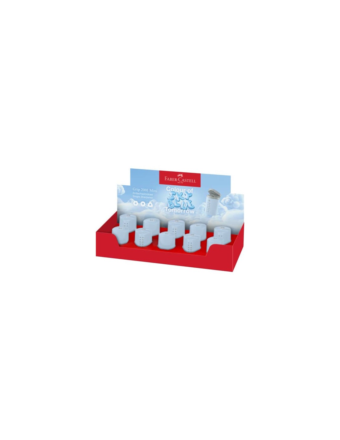 Temperamatite di dimensioni ridotte, perfetto da portare con sè. Forma triangolare con classico disegno Grip e vite di sicurezza. Dotato di temperamatite universale. La copertura del foro impedisce la fuoriuscita dei trucioli. Colore sky blue. Confezione da 10 pezzi.