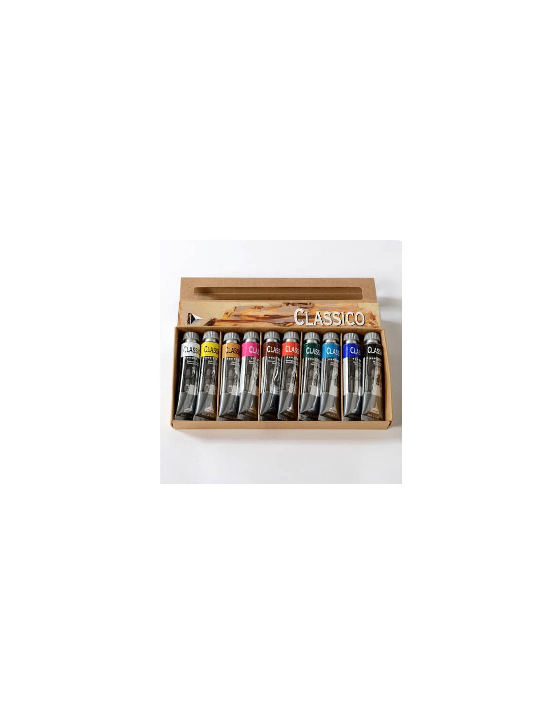 Colori a olio in blister in cartone da 10 tubetti in alluminio. Colori permanenti. Totale assenza di cere e componenti nocivi. Pasta pittorica morbida e lavorabile a spatola. Ottimo per velature o pittura a corpo. Bianco e colori chiari prodotti con oli non ingiallenti. Concentrazione di pigmento elevata. Alta resistenza alla luce secondo la normativa ASTM - D4303 per i colori a oilio. Non richiedono fissaggio. Formato 20 ml. Colori assortiti.