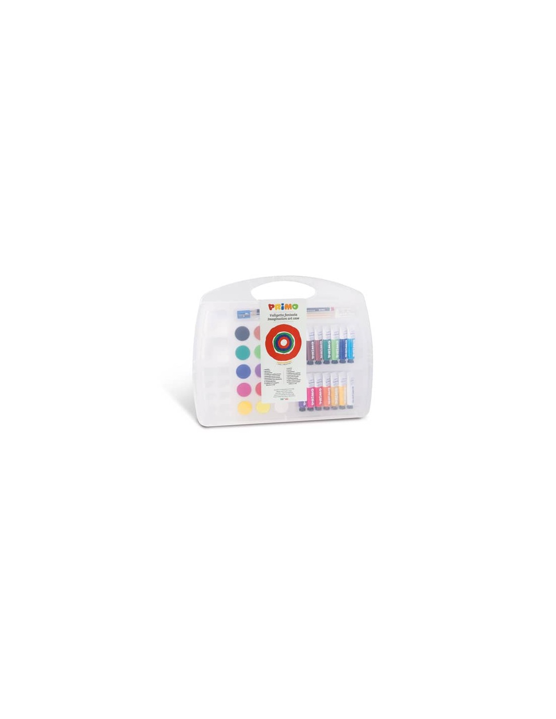 Valigetta in plastica composta da 15 tubi tempera, 14 acquerelli, 2 pennelli, 1 matita HB, 1 temperamatite, 1 gomma, 1 tavolozza.