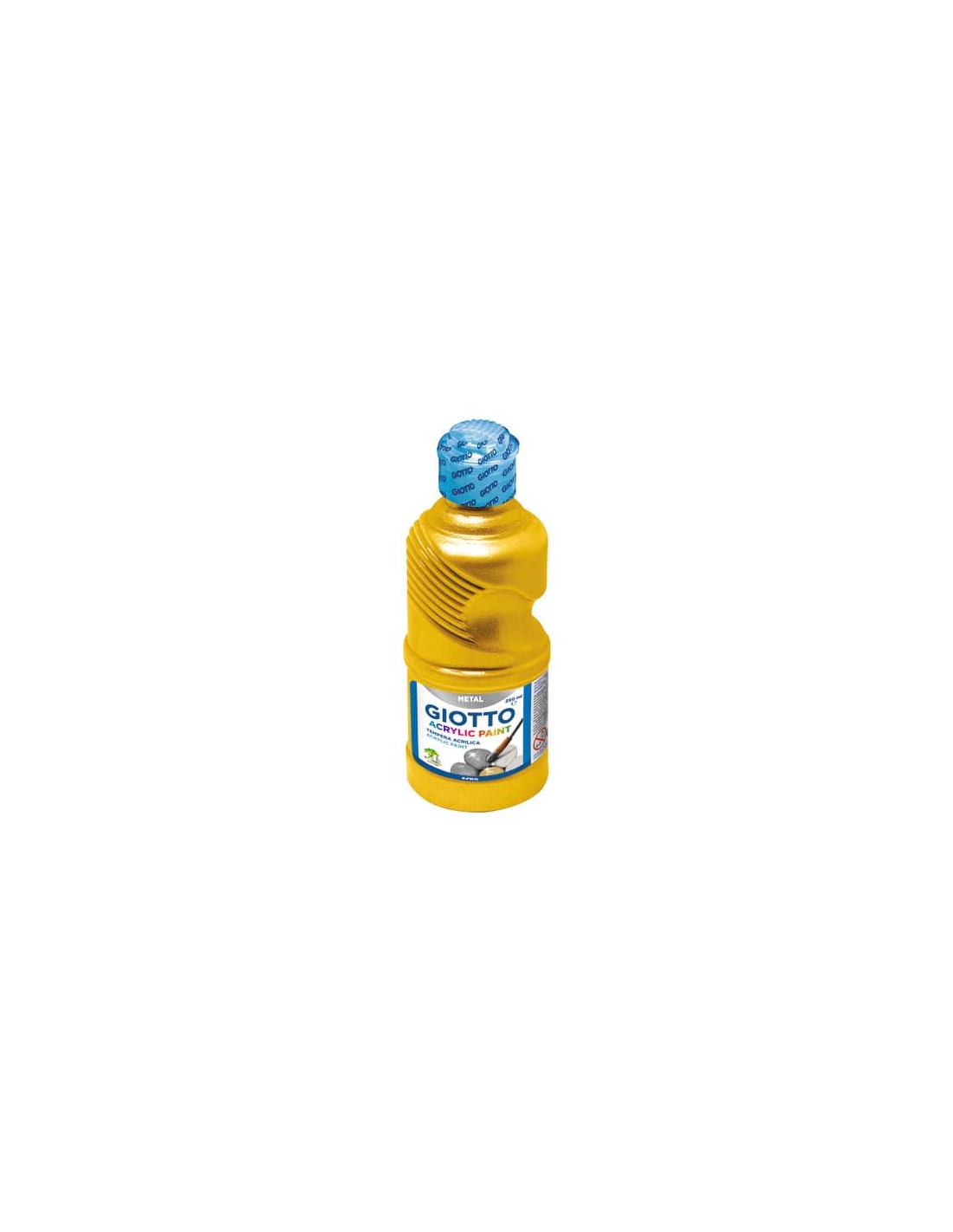 Tempere Giotto Acrylic. Appositamente studiate e realizzate per i bambini e quindi innocue e ideali per qualsiasi applicazione. Formulate con una speciale resina che conferisce buona applicabilità e facile stesura su vari supporti quali: vetro, plastica, legno, ecc. Una volta asciutte, donano un effetto vernice brillante ai supporti trattati. Colore: oro. Flacone da 250 ml.