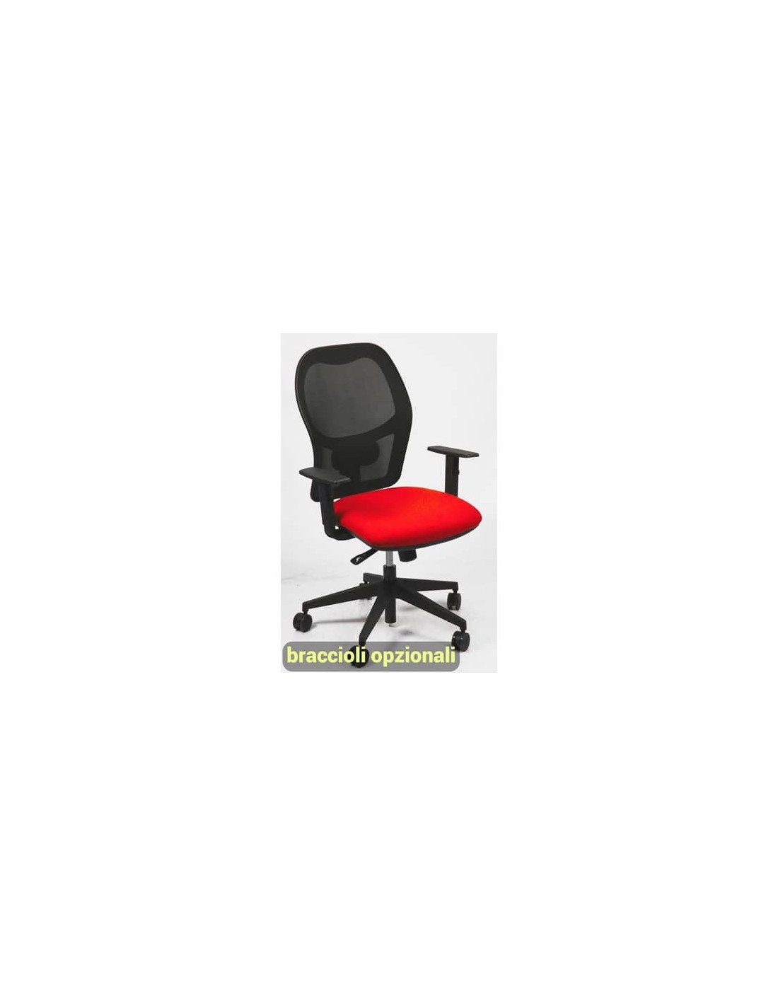 Struttura in acciaio, schienale in Nylon. Rivestimento, cucito artigianalmente, in tessuto ignifugo Classe No Flame, fibra modacrilica, reazione al fuoco classe 1 – 380g m/lin; Colore rosso. Con ruote, braccioli opzionali (codici 110071, 110072, 110074, 110075).