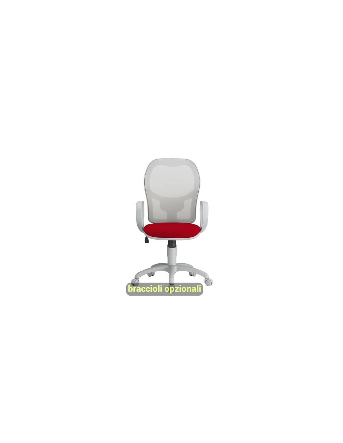 Struttura in acciaio, schienale in Nylon a rete. Rivestimento del sedile in tessuto ignifugo Classe No Flame, fibra modacrilica, reazione al fuoco classe 1 – 380g m/lin, di colore rosso. Con ruote, braccioli opzionali.