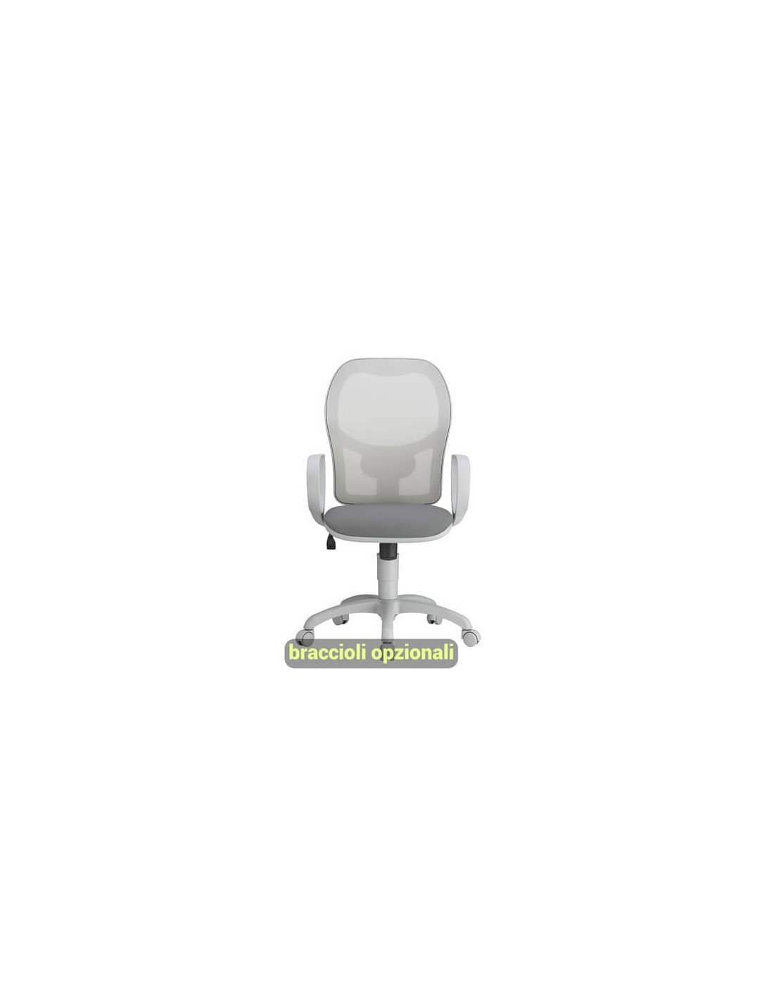 Struttura in acciaio, schienale in Nylon a rete. Rivestimento del sedile in tessuto ignifugo Classe No Flame, fibra modacrilica, reazione al fuoco classe 1 – 380g m/lin, di colore grigio scuro. Con ruote, braccioli opzionali.