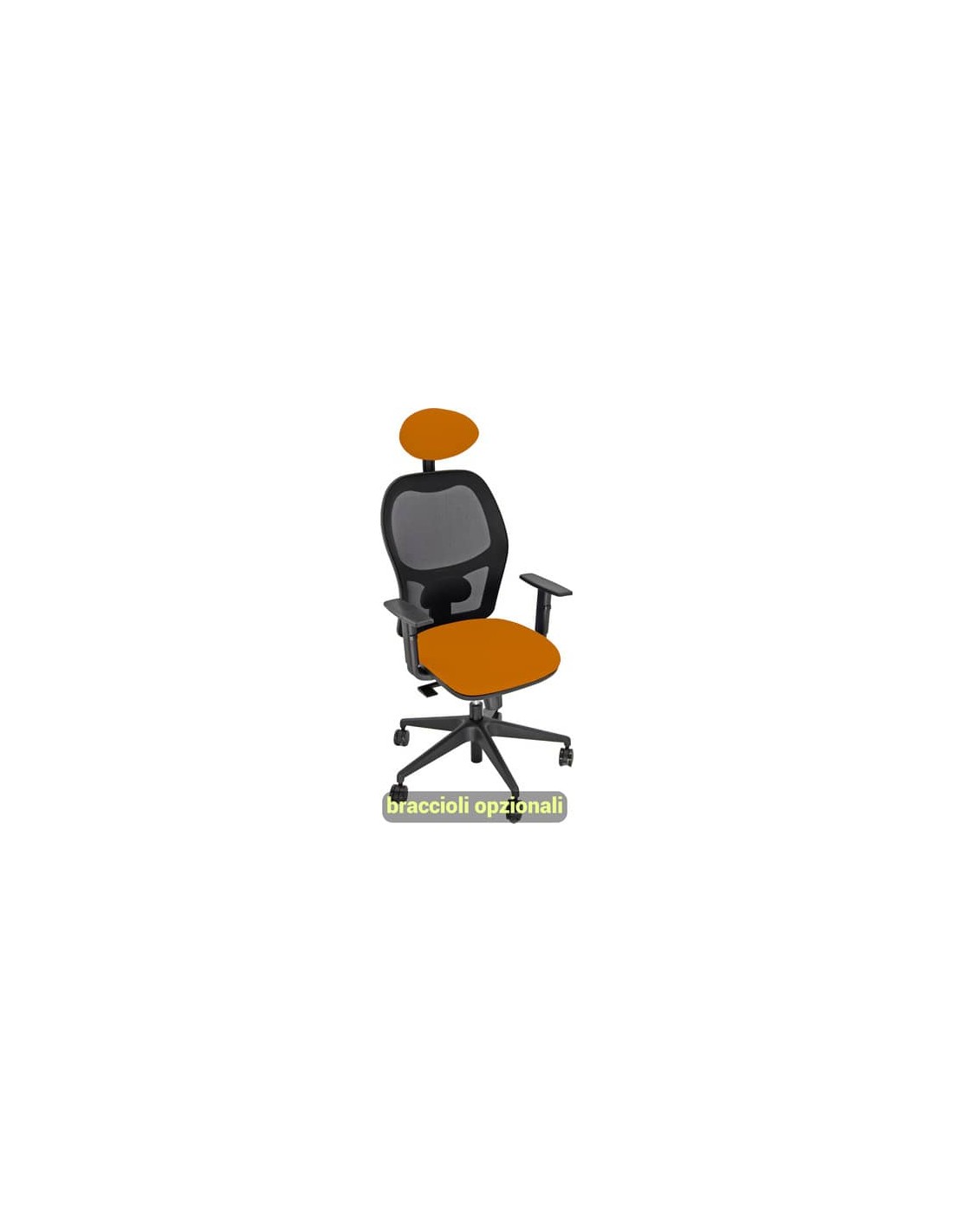 Struttura in acciaio, schienale in Nylon a rete. Rivestimento del sedile 100% Polipropilene 380g m/l, di colore arancione. Con ruote, braccioli opzionali