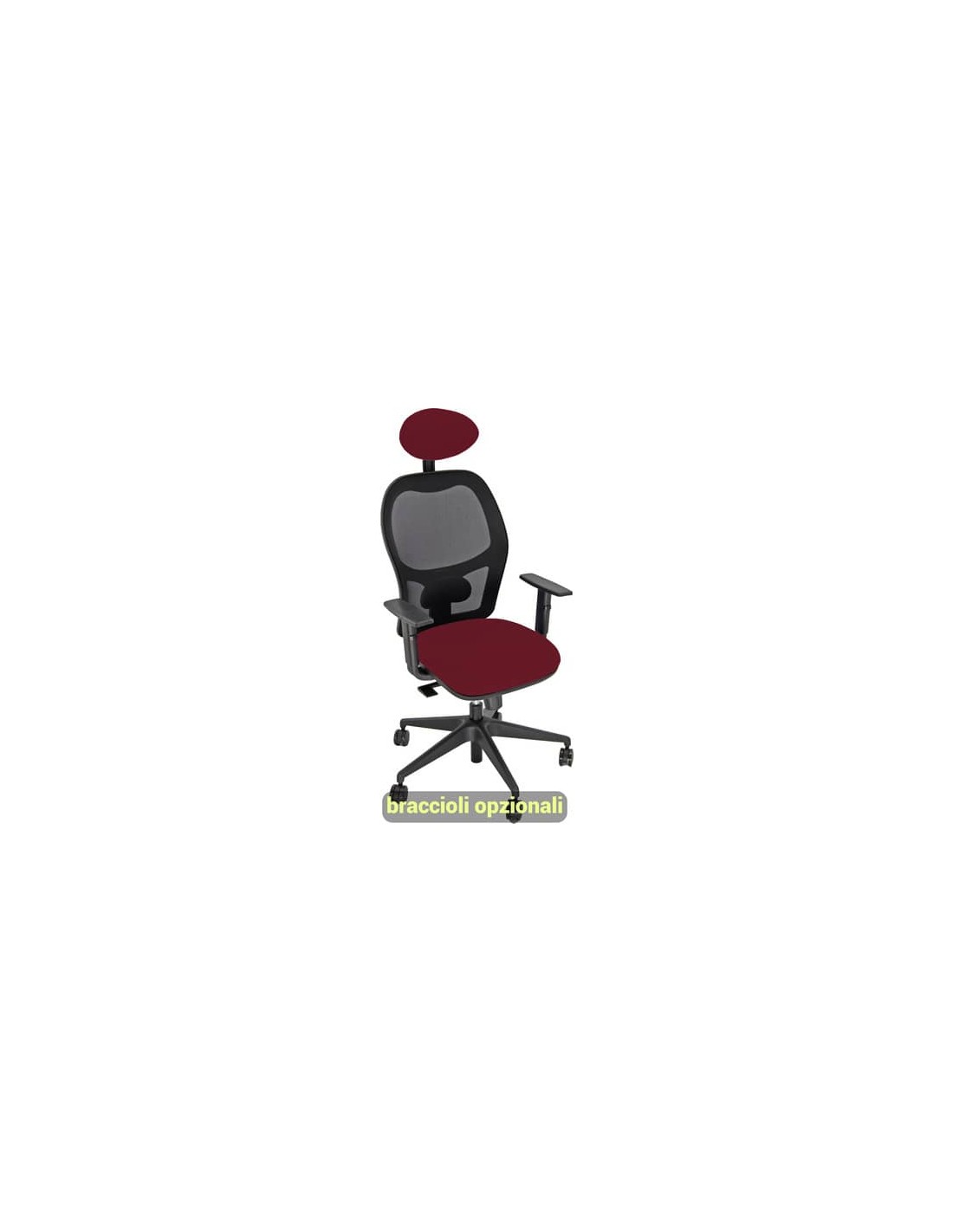 Struttura in acciaio, schienale in Nylon a rete. Rivestimento del sedile, cucito artigianalmente, in tessuto ignifugo Classe No Flame, fibra modacrilica, reazione al fuoco classe 1 – 380g m/lin, di colore bordeaux. Con ruote, braccioli opzionali.