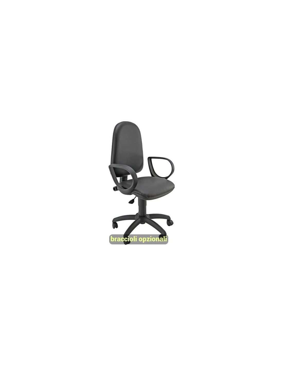 Struttura in acciaio nero, base in Nylon, guscio inferiore e dorsale in PPL nero. Rivestimento di sedile e schienale in tessuto similpelle di colore nero. Con ruote, braccioli opzionali (codici 110074, 110075).
