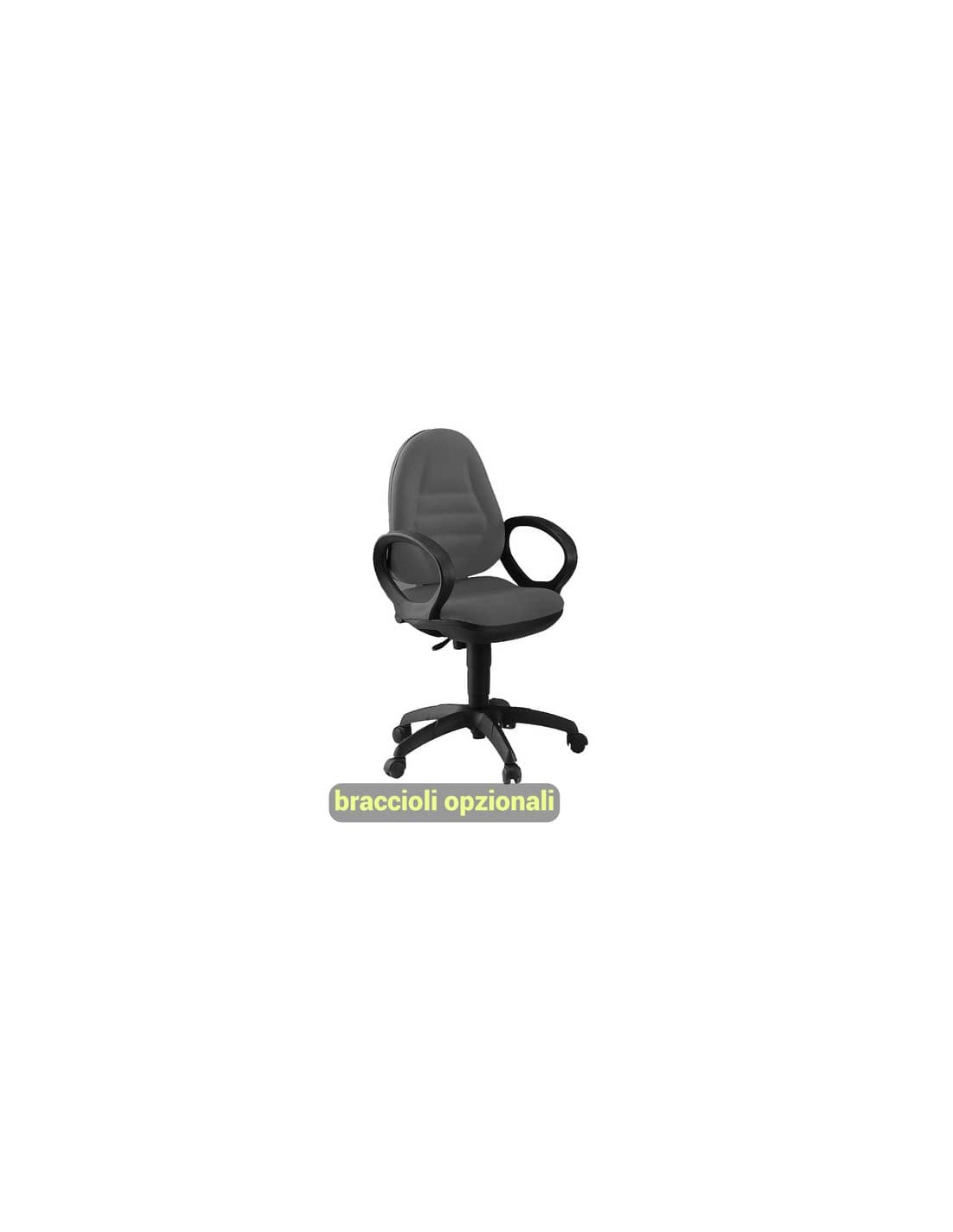 Seduta e schienale imbottiti, rivestiti in tessuto Eco, 100% Polipropilene 380g m/l, di colore grigio scuro. Con ruote, braccioli opzionali (codici 110074, 110075).