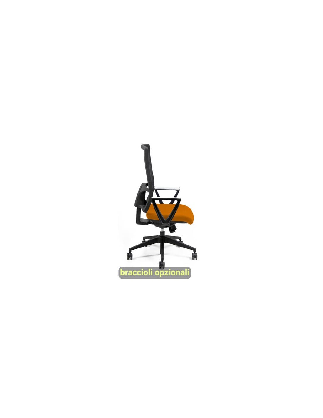 Struttura in acciaio nero, guscio inferiore in PPL nero, base in acciaio. Rivestimento del sedile in tessuto Eco, 100% Polipropilene 380g m/l, di colore arancione. Con ruote, braccioli opzionali (codici 110071, 110072, 110074, 110075).