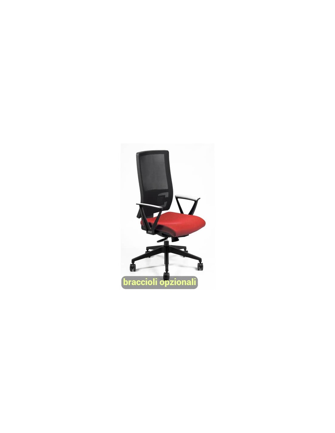 Struttura in acciaio nero, guscio inferiore in PPL nero, base in acciaio. Rivestimento del sedile in tessuto Eco, 100% Polipropilene 380g m/l, di colore rosso. Con ruote, braccioli opzionali (codici 110071, 110072, 110074, 110075).