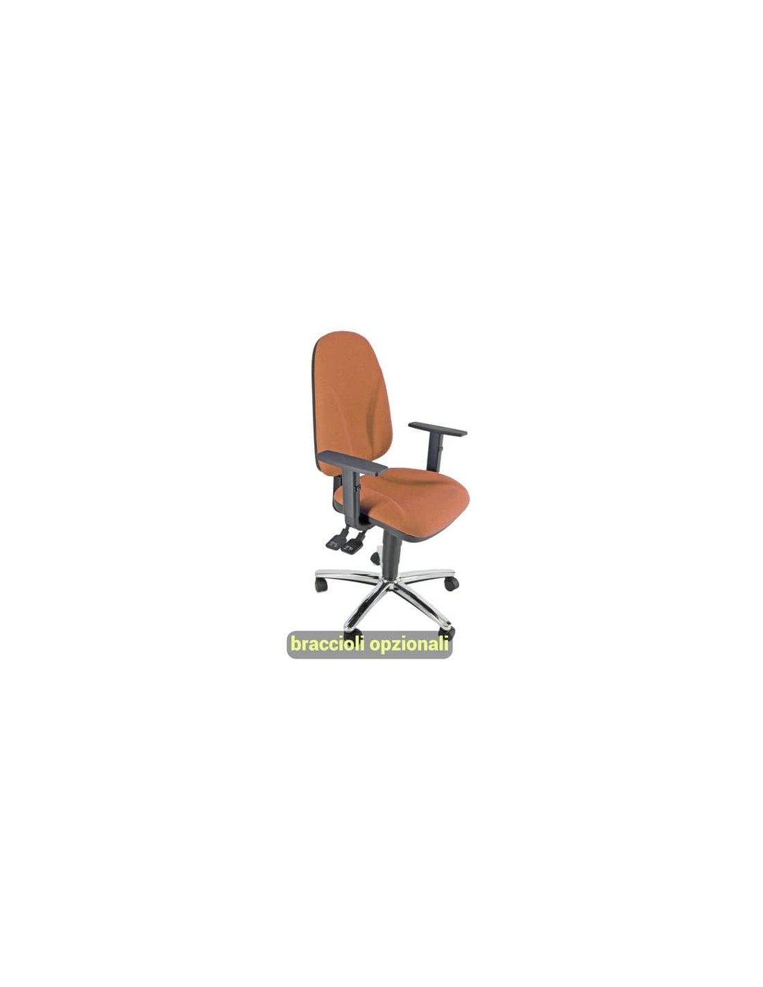 Struttura in acciaio nero, guscio inferiore e dorsale in PPL nero, base in acciaio cromato Rivestimento del sedile e dello schienale in tessuto Eco, 100% Polipropilene 380g m/l, di colore arancione. Con ruote, braccioli opzionali.