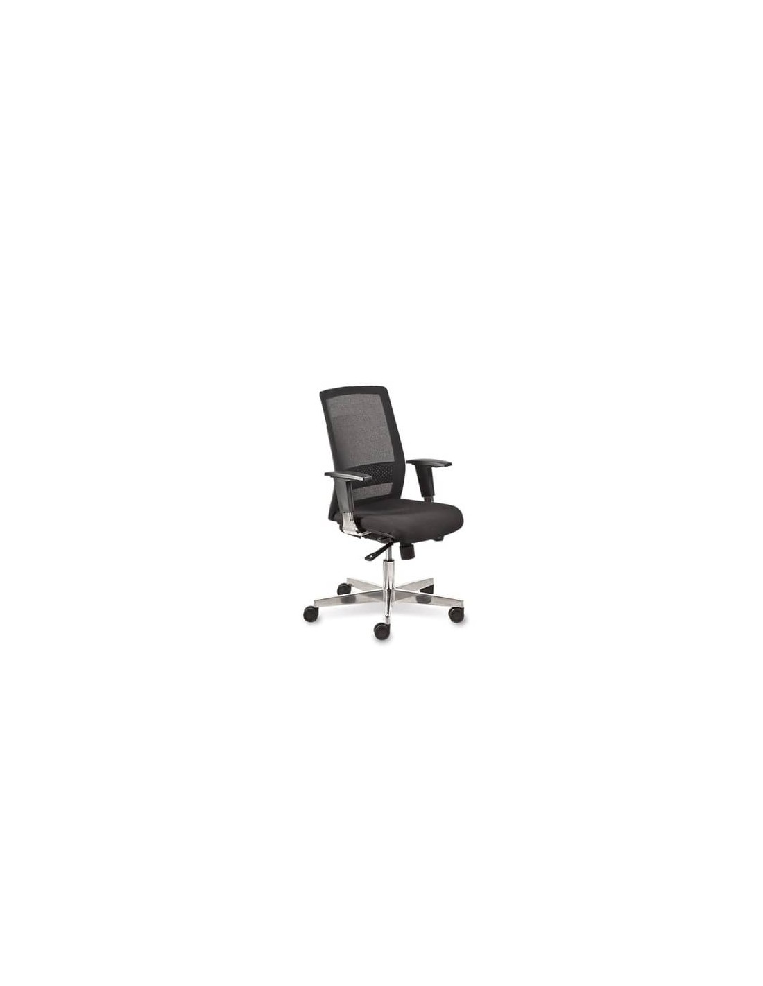 Poltrona semi-direzionale Olimpia Syncro con braccioli regolabili, schienale ergonomico a rete e base in alluminio spazzolato. Colore nero. Meccanismo Syncro regolabile in 4 posizioni con traslatore longitudinale del sedile e regolazione di tensione e sicurezza anti-shock. Schienale a rete con poggiareni flessiblile e regolabile. Sedile imbottito ad alta densità rivestito con tessuto ignifugo. Dimensioni ingombro 68 x 66 x 95 cm. Misure sedile L. 50 x P. 47 cm, schienale L. 49 x H. 54 cm, poggiatesta L. 26 x H. 16 cm. Regolazione in altezza del sedile da 41 a 52 cm. Base D.700 mm in poliammide caricato 30% FV. Ruote piroettanti D. 65 mm. Sedile interno in multistrato di faggio 11 mm con imbottitura alta densità 40 kg/m3 di spessore 40 mm. Carter in PP antigraffio nero. Struttura schienale in poliammide nero. Rete 100% poliestere. Supporto lombare flessibile in PP. Peso 18 kg, portata utile 120 kg 8 ore/giorno. Rispetta il d.lgs 81/08 all.xxxiv. Prodotto 100% Made in Italy.