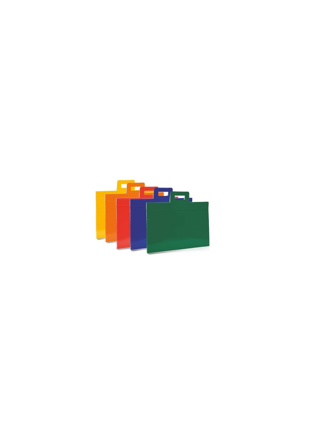 Cartelletta portadisegni in cartone plastificato con elastico di chiusura. Attraverso una maniglia a scomparsa si trasforma in una comoda valigetta per il trasporto di disegni, progetti, ecc. Confezione da 12 pezzi in 5 colori assortiti.